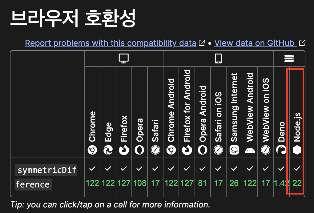 3. Set 자료 구조를 사용해서 symmetricDifference 메서드를 사용하려고 했음. 하지만 동작하지 않음 mdn 찾아보니 Node 22부터 지원됨. Softeer은 12.22.12 버전 사용중(25.4.24 기준) -> symmetricDifference를 직접 구현함 (set 자료구조의 has, add, delete 메소드가 있어서 쉽게 구현할 수 있었음)