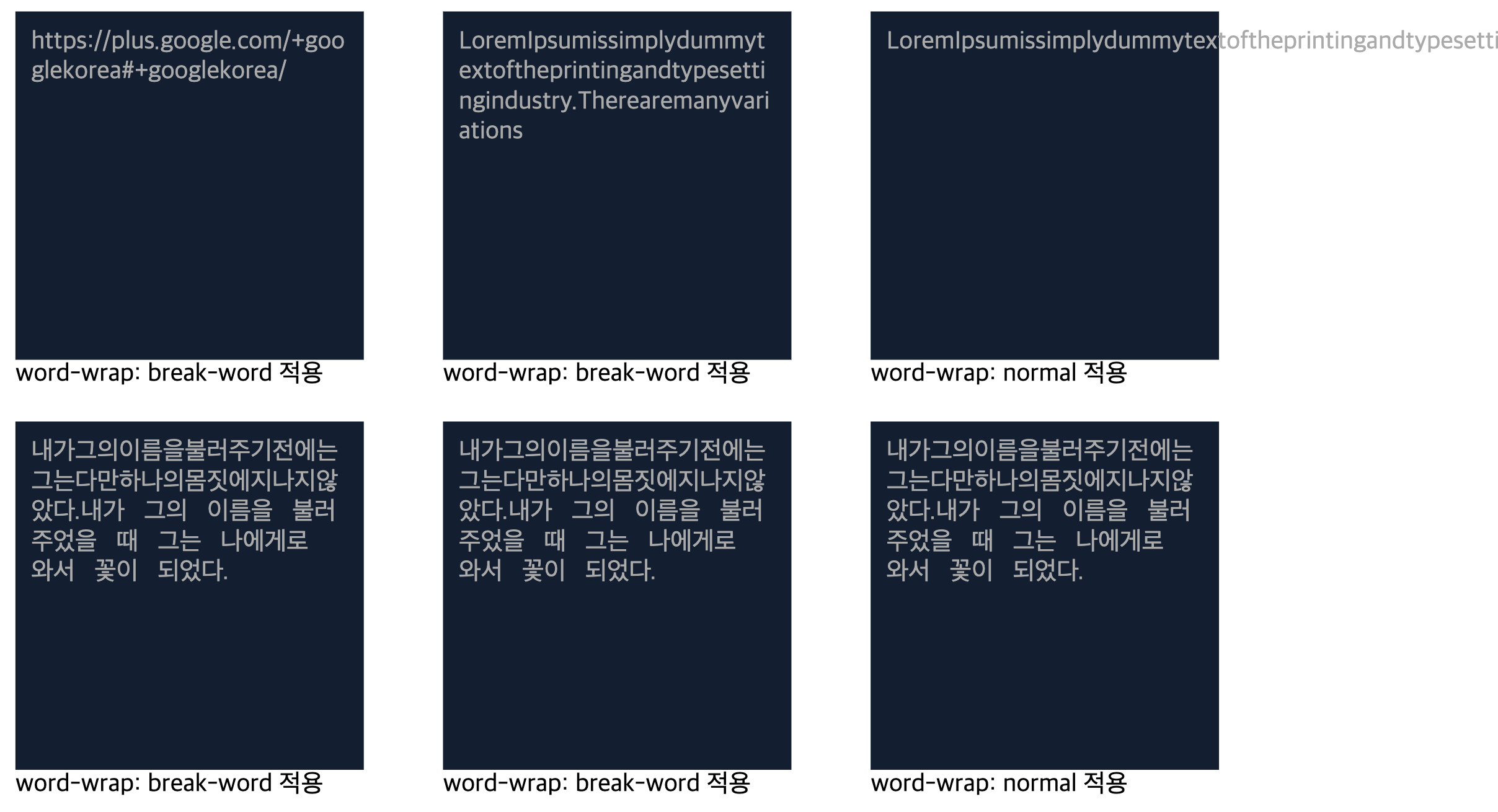 - break-word: 글자가 길어지면 강제로 끊어서 줄 바꿈 처리 → 단어의 기준을 글자로 바꿈